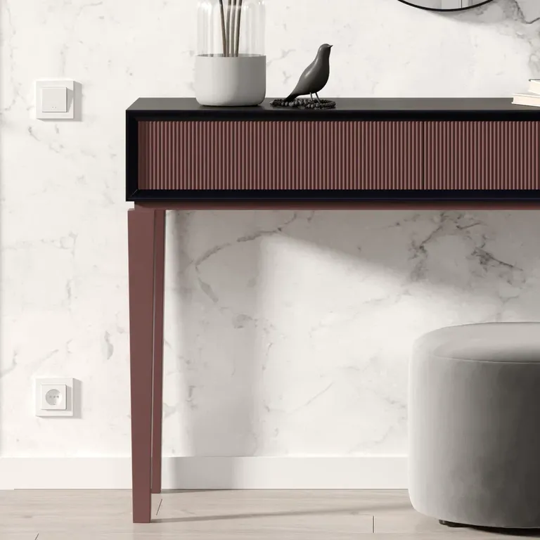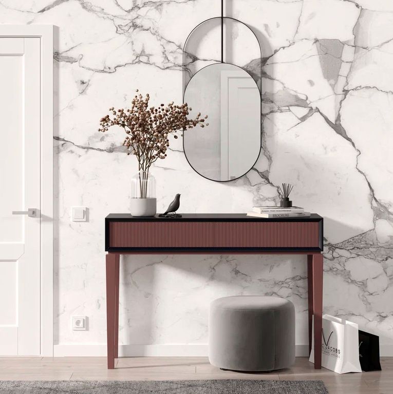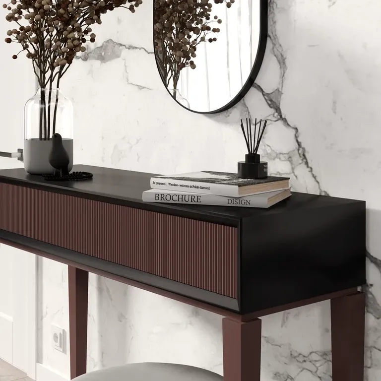 Сама элегантность. Консоль в силе неоклассика с 3 Д фасадами украсит любую зону Вашего дома. Ящики снабжены механизмом Push-to-open - открытие от нажатия.