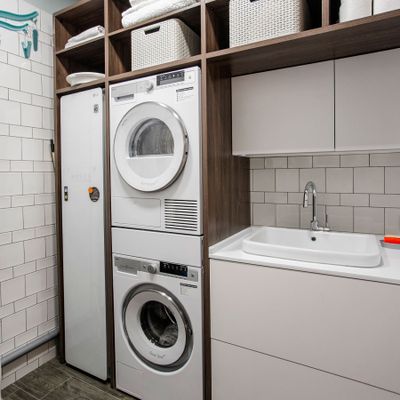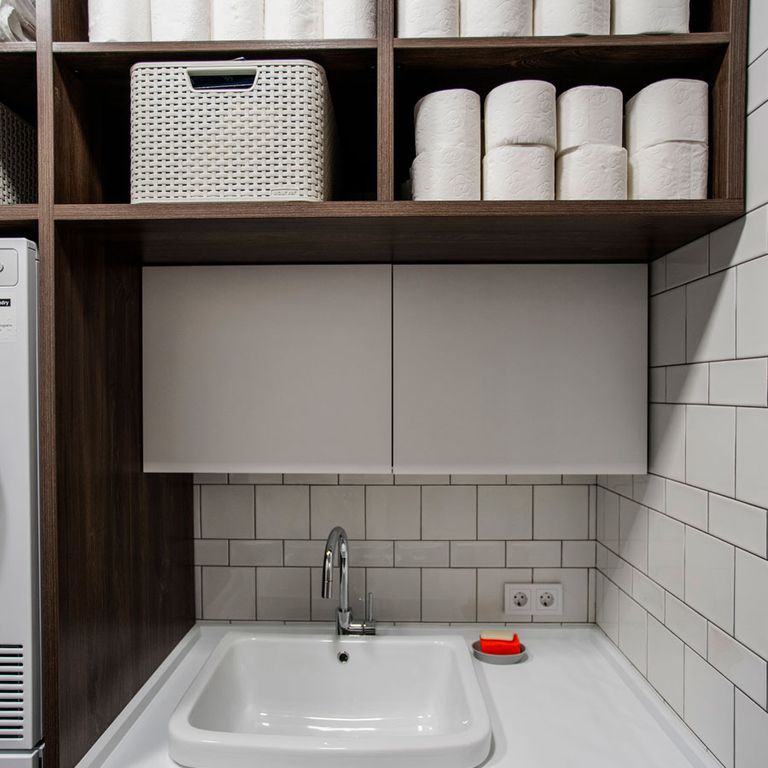 Мебель предназначена для оснащения прачечных комнат в домах и заведениях общепита. Представляет собой шкаф с несколькими отделениями, корпус которого выполнен из устойчивой к воздействию влаги ЛДСП Egger. Фасады имеют матовую текстуру. В отделениях шкафа оборудованы полки для хранения хозяйственных принадлежностей. Также предусмотрены столешница со смесителем, встроенная гладильная доска, место под стиральную и сушильную машины, а также химчистку на дому. Комплект мебели для прачечной имеет компактные габариты, его можно установить вдоль стены или в нишу.